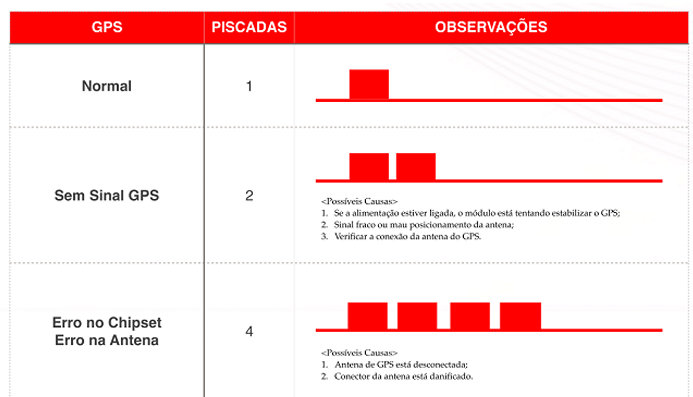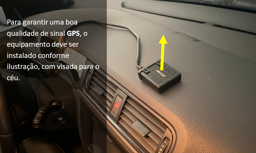 A antena de GPS deverá ser instalada em local não visível, de difícil acesso e não pode ser fixada em baixo de estrutura metálica. Para equipamento com antena de GPS interna utilizar o mesmo conceito. Na maioria dos equipamentos, vem indicado o lado que deve estar voltado para cima (com visada para o céu).